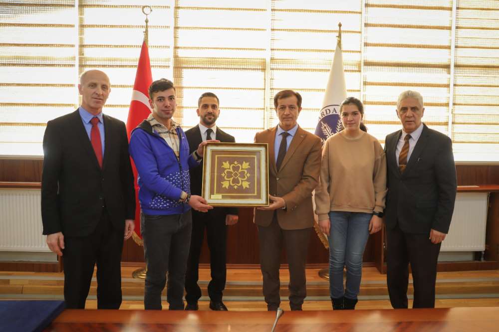 Üniversitemiz, Dünya Engelliler Haftası kapsamında özel gereksinimli bireylere yönelik anlamlı bir farkındalık programına ev sahipliği yaptı. İl Millî Eğitim Müdür V. Atanur Sarıçam ile Ardahan Özel Eğitim Meslek Okulu öğrencileri ve öğretmenleri Üniversitemizde ağırlandı. Ziyaret programı, Senato Odası’nda Rektörümz Prof. Dr. Öztürk Emiroğlu’nun konukları makamında ağırlamasıyla başladı. Rektörümüz, öğrencilerle yakından ilgilenerek samimi sohbetlerde bulundu ve Dünya Engelliler Haftası’nı kutladı. Özel gereksinimli bireylerin toplumun ayrılmaz bir parçası olduğunu vurgulayan Rektörümüz, bu tür etkinliklerin farkındalığı artırmada ve toplumsal bütünleşmeye katkı sağlamada büyük önem taşıdığını ifade etti. Program kapsamında, SKS Daire Başkanlığı tarafından misafir öğrenciler için ARÜ Sineması’nda özel bir film gösterimi düzenlendi. Ardından öğrenciler, Üniversitemizin bowling salonunda gerçekleştirilen etkinlikte eğlenceli anlar yaşadı. Üniversite öğrencileriyle birlikte yemek yeme imkânı sunulan özel bireylerin kampüs atmosferini deneyimlemeleri, sosyal etkileşimde bulunmaları ve motivasyonlarının güçlendirilmesi hedeflendi. Dünya Engelliler Haftası etkinlikleri çerçevesinde ayrıca Goalball Turnuvası Finali ve Ödül Töreni gerçekleştirildi. Özel gereksinimli öğrencilerin katılımıyla büyük bir heyecanla geçen turnuvada, sporcular gösterdikleri performansla izleyenlere gurur dolu anlar yaşattı. Final müsabakalarının ardından dereceye giren takımlara ödülleri takdim edildi. Goalball etkinliği, özel bireylerin spora katılımını teşvik ederek fiziksel, sosyal ve psikolojik gelişimlerine önemli bir katkı sundu. Programın sonunda Ardahan Özel Eğitim Meslek Okulu Müdür Yardımcısı Mustafa Kemal Beyaztaş ile İl Millî Eğitim Müdür V. Atanur Sarıçam, etkinliğe sağladıkları desteklerinden dolayı Rektör Prof. Dr. Öztürk Emiroğlu’na, SKS Daire Başkanı Metin Çimli’ye ve SKS Başkanlığı Şube Müdürü Nurcan Günal Torun’a günün anısına hediye takdim etti. Üniversitemizde gerçekleştirilen bu kapsamlı program, özel gereksinimli bireylerin sosyal yaşama katılımına destek olurken, üniversite öğrencileriyle anlamlı bir etkileşim ortamı oluşturması bakımından büyük önem taşıdı.
